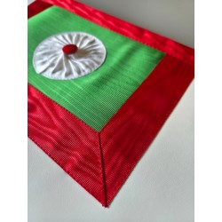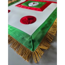 Tablier R.Dép.M. (36x40) simili, 2 cocardes rouges + 1 blanche, bav. rectangle, dblé vert, frangé or